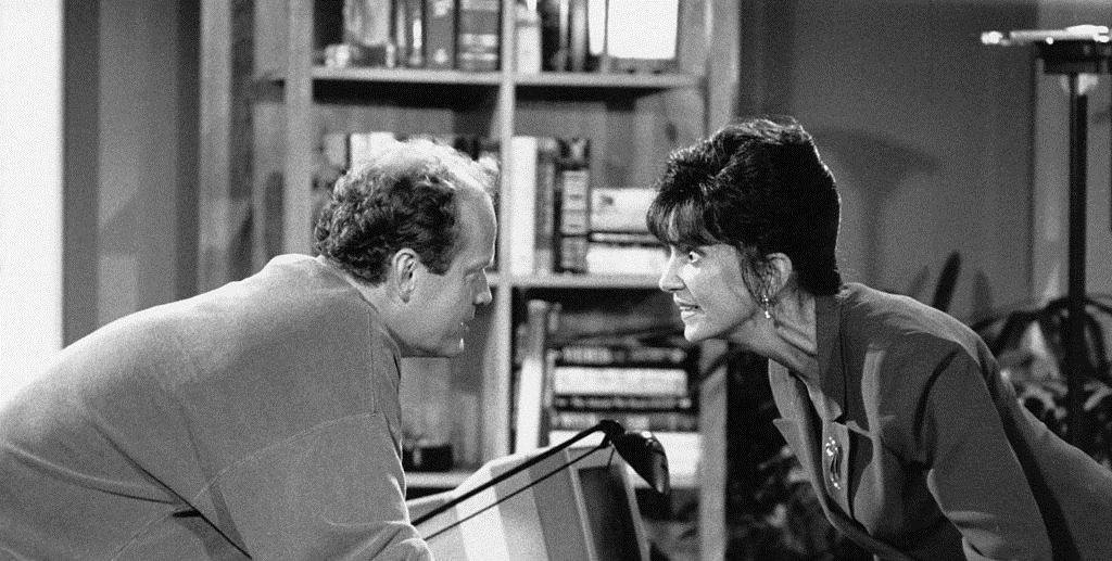 OSCAR-WINNER MERCEDES RUEHL GUEST-STARS – Frasier holds his ground when the new station manager, Kate Costas (Oscar and Tony winner Mercedes Ruehl), orders him to make changes in the show which she could use for promotion purposes. As a result, Frasier loses a lot of sleep – and almost his mind – when he and Roz are relegated to working the graveyard shift. Meanwhile, Niles asks Martin to get him a gun for protection, and Eddie gets into scrapes with the neighbouring dogs.
